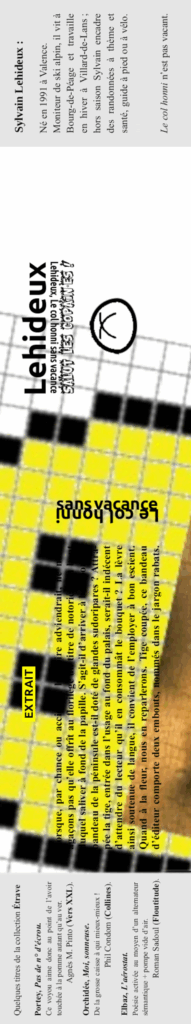Simulacre de jeu, un quiz en vers niais : cliquer page 29 (27 après ajustement) sur le mot, l’espace typographique ou le nombre suivants pour accéder – eu égard à de l’enjambement* démesuré par sa coulisse – à un virtuel feuillet : « Pied 2 ».